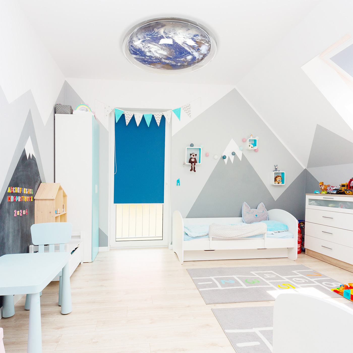 Plafón de techo con diseño del planeta Tierra y cubierta transparente que simula la atmósfera. Aporta una iluminación envolvente y un efecto decorativo único, ideal para dormitorios infantiles, espacios creativos o ambientes temáticos. Un plafón que convierte la luz en experiencia.