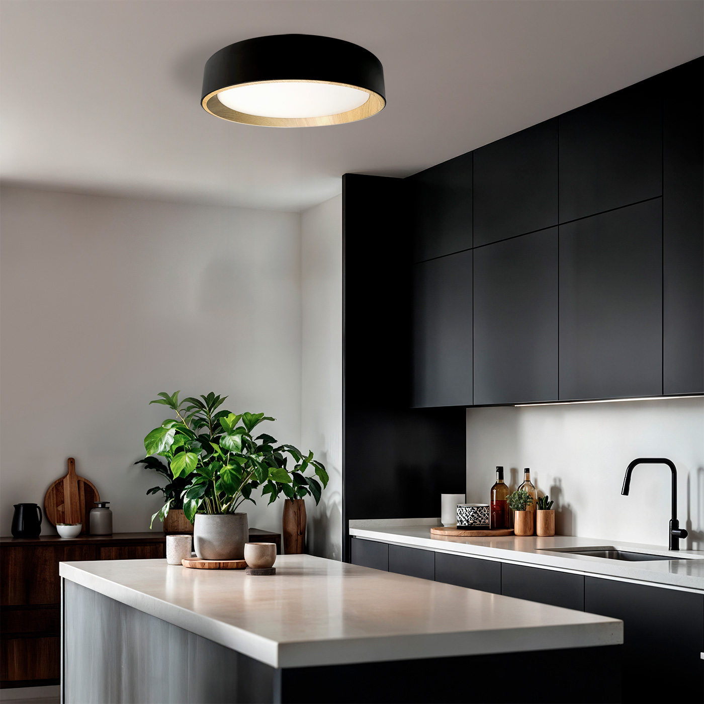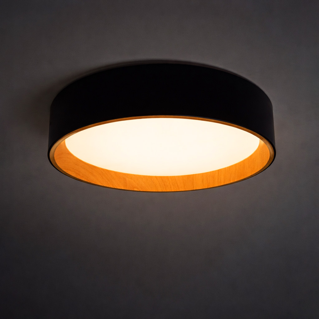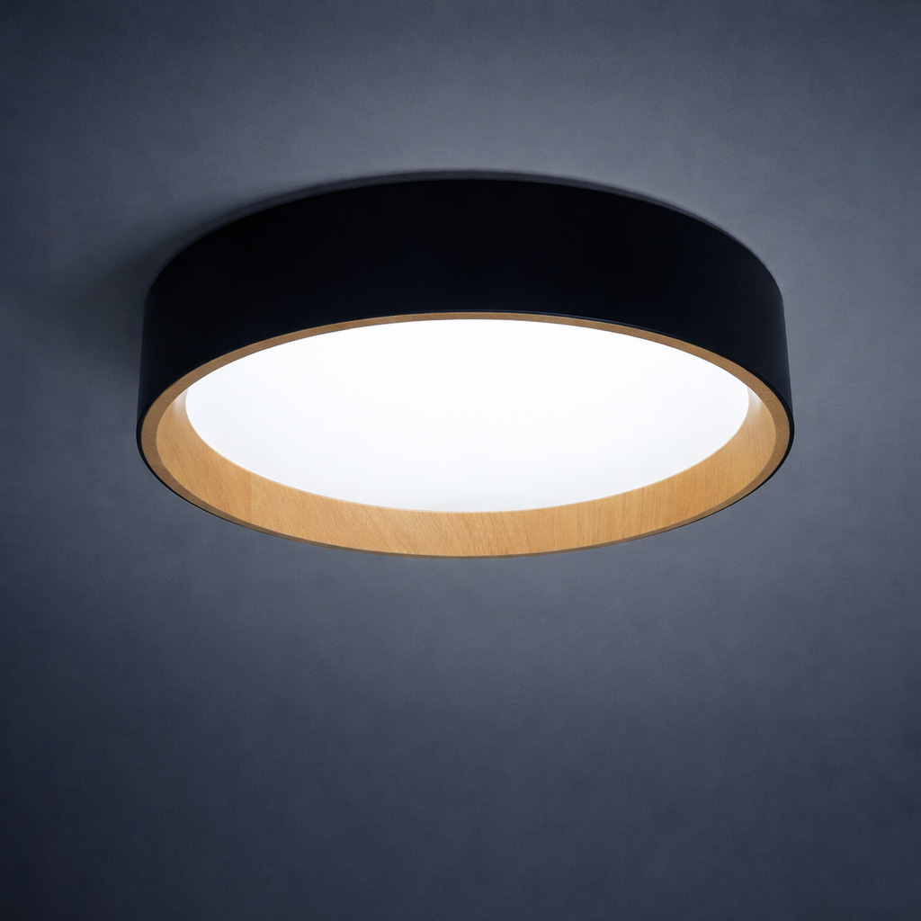 Plafón de techo con luz LED integrada y diseño moderno en acabado negro con detalle interior efecto madera. Aporta una iluminación cálida y uniforme, ideal para salones, dormitorios o espacios contemporáneos. Una combinación perfecta de funcionalidad y estilo.