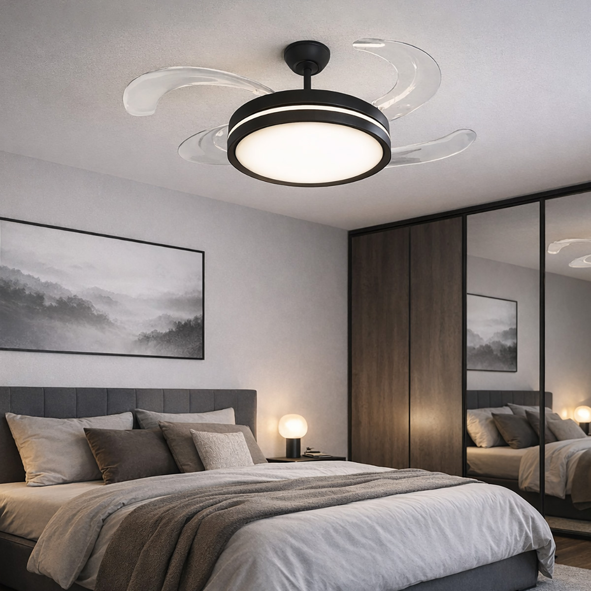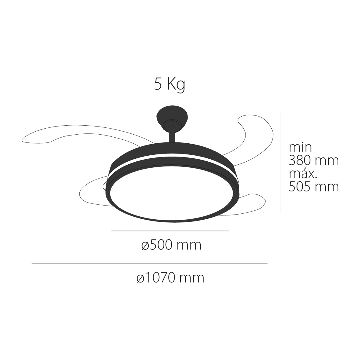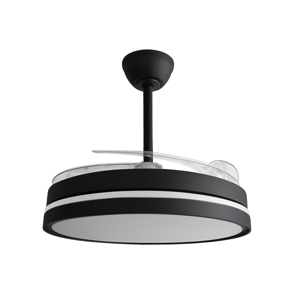 Ventilador de techo negro con luz LED integrada y palas retráctiles. Diseño moderno y elegante que combina iluminación y ventilación en un solo elemento. Funcionamiento silencioso y control mediante mando a distancia para un confort total. Ideal para dormitorios y estancias contemporáneas.