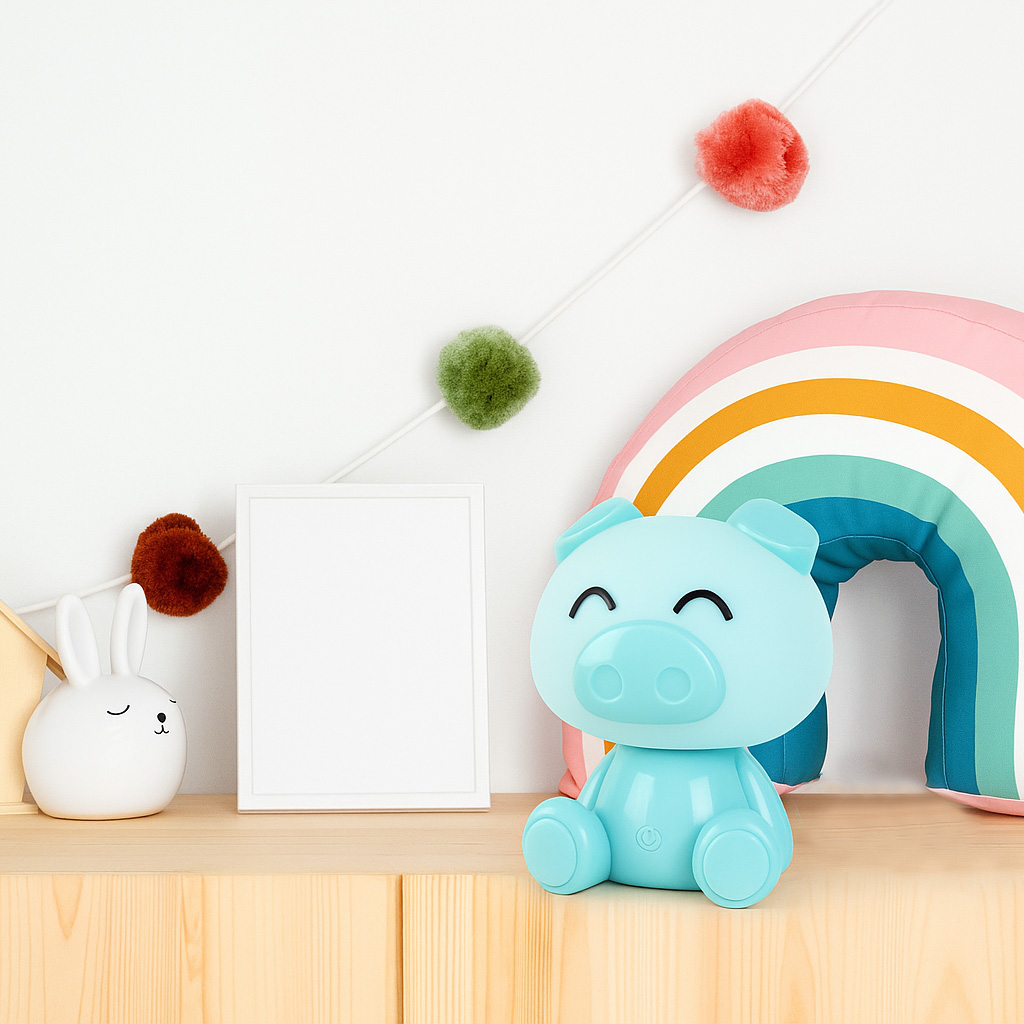 Esta encantadora lámpara LED con forma de cerdito añade un toque de ternura y alegría a cualquier habitación infantil. Su luz cálida y suave crea un ambiente acogedor ideal para acompañar el descanso o la lectura. Con batería recargable por USB y encendido táctil, combina practicidad, seguridad y diversión en un solo diseño.