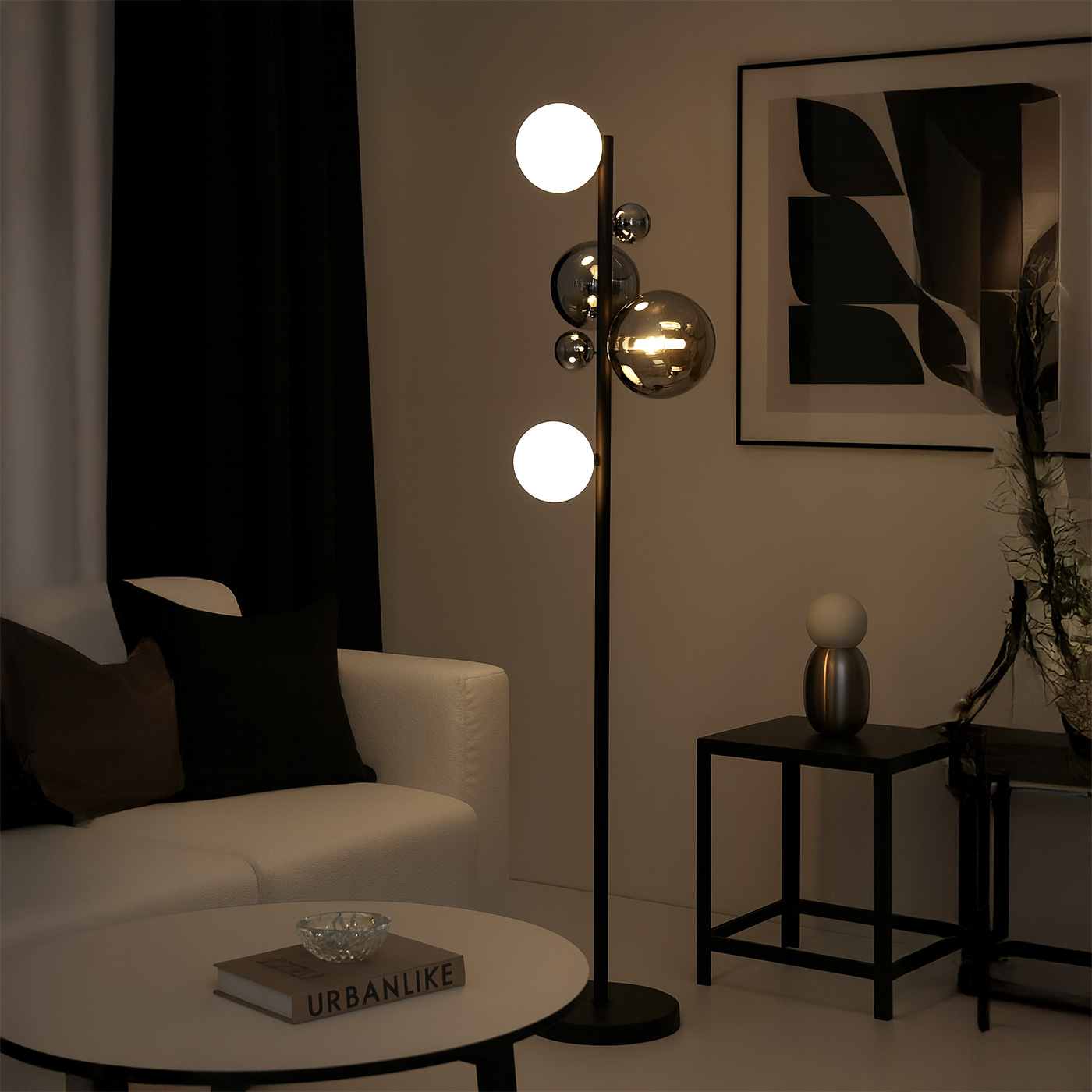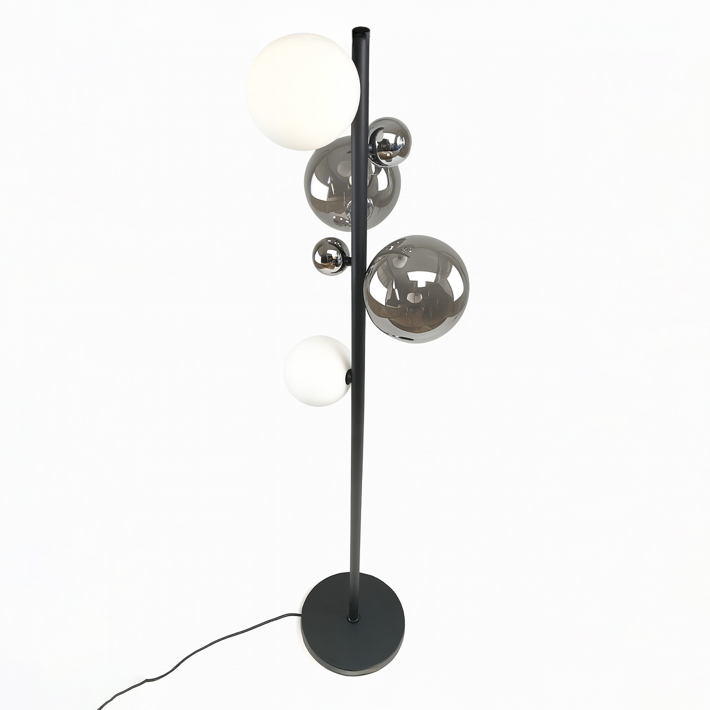 Una lámpara que combina esferas metálicas y opalinas en un juego de reflejos y luz suave, creando una pieza escultórica que destaca en cualquier ambiente. Su estructura en negro mate aporta un aire moderno y sofisticado, ideal para interiores de diseño.