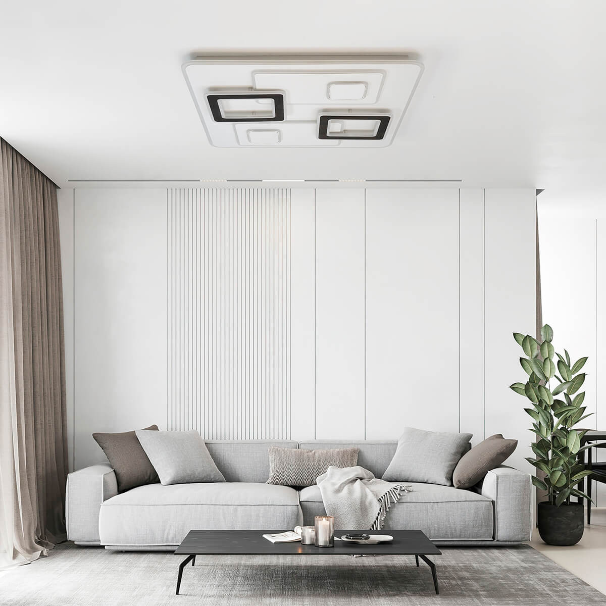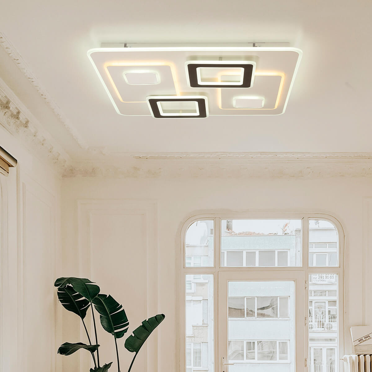 Plafonieră moderna cu forma patrată si marginile rotunjite.Lumina survine prin formele geometrice.